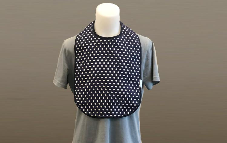 Made with a cotton top and soft waterproof backing, designed with multiple domes so you can easily adjust the neck size for a comfortable fit. The adult sizing has some extra snaps to allow the bottom to fold up into a tray if needed.