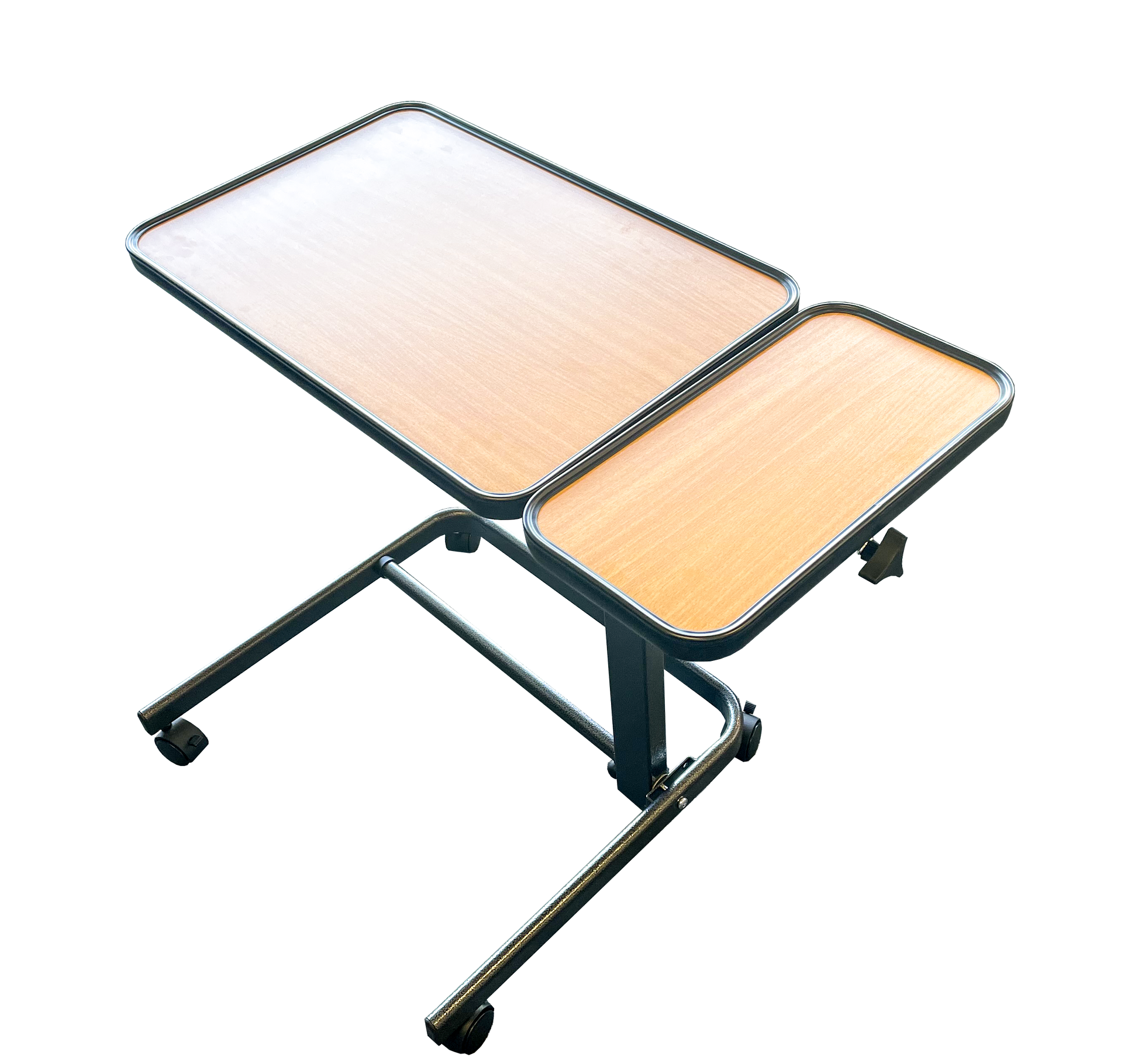 This versatile Over Bed Table features a split top design. The smaller end remains stationary, while the larger section is adjustable, allowing for tilting. The frame is easily adjustable to different heights and can be folded flat for convenient storage.